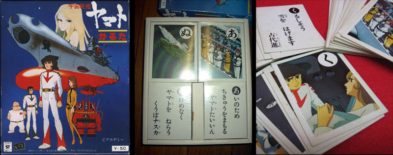 Nomura Toy Company, a major licensor for the Yamato 2 TV series, released this ‘Karuta’ [playing card] set which included images from both Space Battleship Yamato and Farewell. In Western terms, we would call them flash cards, since they were meant to teach the 45 characters in the Hiragana alphabet. The picture cards included a single character that was also highlighted on the sentence cards. Nomura released many more of these sets with various tie-ins to other children’s programs, as shown at right.