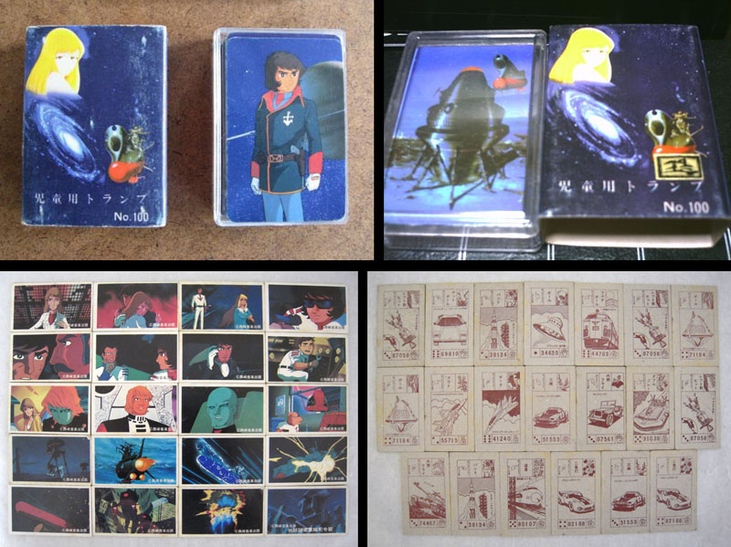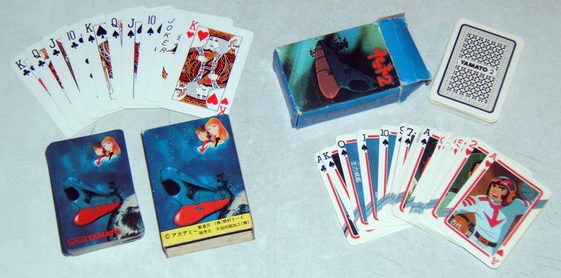 Plain-jane playing cards were also made in two variations. Nomura made the Farewell set shown at left, and the Yamato 2 set shown at right was a bonus item in the February issue of Tokuma Shoten’s Terebi Land magazine. In this case, the faces were anime images; Hearts were hero characters, Spades were hero spacecraft, Clubs were enemy characters, and Diamonds were enemy spacecraft.