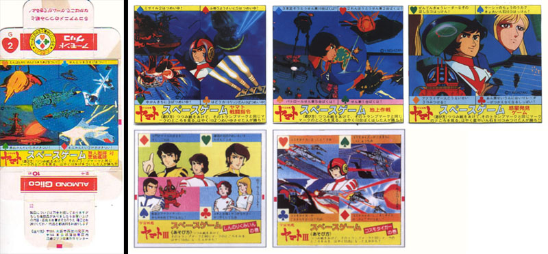 Japan’s Ezaki Glico confectionary company has been in business close to 100 years, and established an early partnership with anime when it sponsored the original Tetsujin 28 TV series in 1963. They hopped on the Yamato bandwagon in 1978 and pumped out collectibles in enormous numbers, including a line of “Space Games” on the boxes of their almond candies. This is just a small sampling of the games based on Be Forever and Yamato III, which involved aligning cards with each other to read a picture-story.