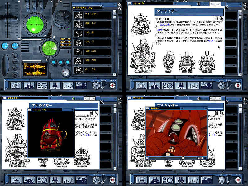 The second button opens the character database, a list of major and minor characters on both sides of the story. The first screen (shown upper right) shows animation models and a description. Further clicking brings up a 3-D VR model that can be rotated and an animation clip showing that character in action. (Note that the only character with a VR model in this collection is Analyzer, since he also appears in the mecha database.)