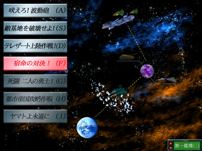 The first game immediately broke with tradition by basing itself on Farewell and Yamato 2 rather than the journey to Iscandar. It followed the major events of the story, with original animation clips and CG cutscenes. From the promotional text: