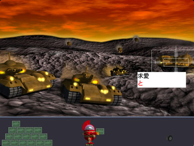 The Space Marines are doing their best against the Comet Empire’s tank corps while Kodai, Sanada, and Analyzer set up the multi-missile launcher. You have to type the tanks away while Analyzer carries the ammo boxes to safety. If they all get destroyed, you lose. See the intro cutscene here.