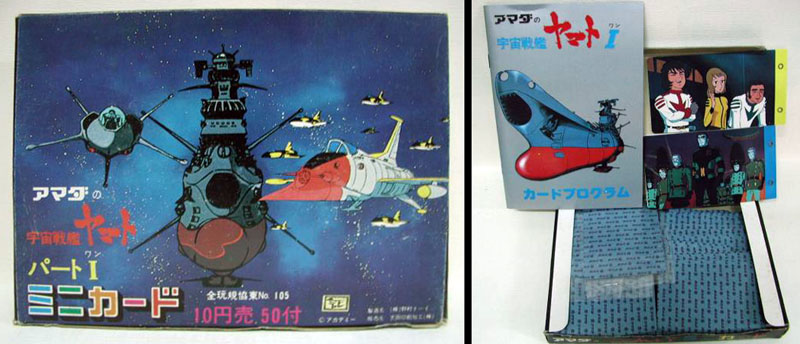 Japan’s Amada Printing Co. was another early entrant into the licensing brotherhood, collaborating with the Nomura Toy company to make mini gum-rubber toys and rolling out collectible card sets of its own. Shown here is their first “Mini Card” set, dedicated to Yamato Part 1. This was actually a re-release of mini-cards that first appeared with the TV series in December 1974 and were reprinted in 1978. Those who bought a complete box got a new 20-page “Card Program” booklet (shown above right) measuring 6″ x 8.5″ that told the story of the first 11 TV episodes.