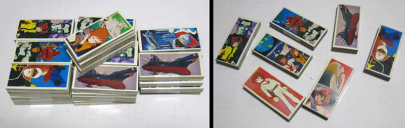 Amada made Mini Card sets for many anime and live action TV programs, and they all followed the same format: 2″ x 2.5″ cards issued by the hundreds to drive collectors crazy and a variety of 3″ x 5.5″ pocket books to keep them in. Pictured above left are 5 of the 7 known pocket books (some shown front and back), along with a small number of the cards for ‘Yamato Part 1.’ There were a total of 60 cards in this set.