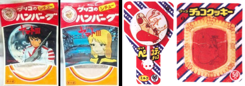 If you were looking for some Yamato food for your TV tray while watching Yamato III, Glico offered up hamburger stew (just add water, heat, and the indiscriminate taste buds of a child). For dessert, you could eat Yamato itself. Shown at right are two examples; the “Peroti Choco” was a disc of white chocolate on a stick and the “Choco Cookie” was a biscuit with Yamato on the surface.