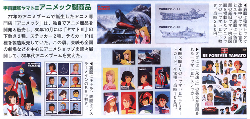 Japan’s first anime boom, which Yamato fueled from 1977 to 1980, reached true critical mass when enough merchandising was in play to support the opening of anime specialty shops. One of the first was Animec, which inspired a magazine by the same name. They upped the ante by creating official merchandising of their own, shown above and below. This began yet another trend that continues today with shops doubling as manufacturers.
