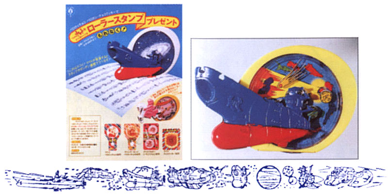 This “Roller Stamp Present” could be acquired in a campaign that ran from December 1980 to the end of March, 1981. A pair of application forms came separately with different snacks and were sent in along with 200 yen to purchase the gizmo. Above left is an ad from the January ’81 issue of Terebi Kun magazine. Below that is the print from one full rotation of the stamp, between 9 and 10 inches long.