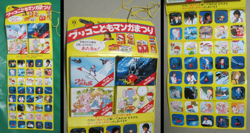 Glico’s “Popular Manga Choco Festival” was a prize campaign that began in October, 1980. For a limited time, buying Glico products would earn you two different types of stickers (large and small) or a fortune-telling card, shown here attached to the backing board.