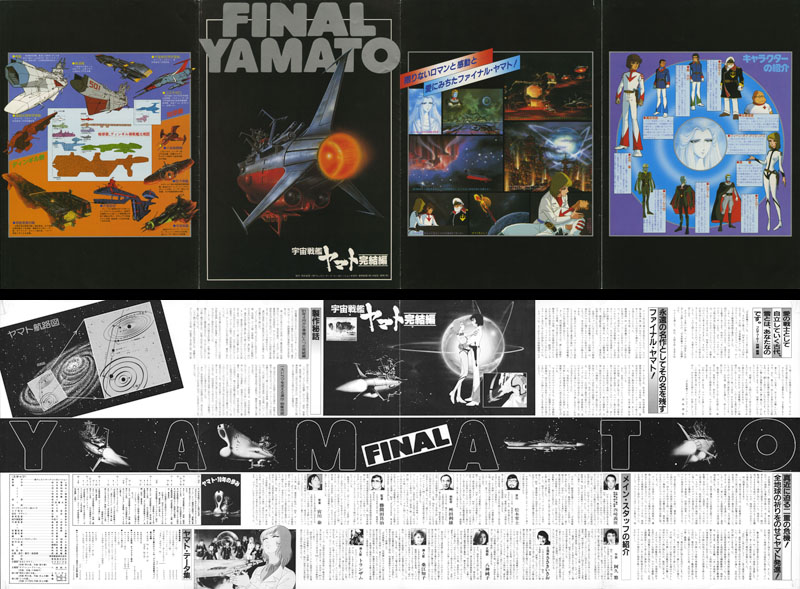 Flyers were (and still are) a primary means of movie promotion in Japan. Final Yamato had at least two in different formats. The first is shown at the top of the page, a simple two-sided color piece that promoted design art. This one was a double-sided foldout with extensive text on the back.