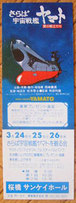 The flyer shown above is from a different event, an Anime Fair that took place at the towering Keio Plaza Hotel in Central Tokyo from July 27 through August 31 and brought together a variety of live events under the big tent of Kamen Rider, Be Forever Yamato, Magic Girl Lalabel and Toward the Terra. A ticket sleeve for the event is shown at right.