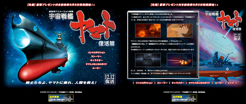 If this were still thirty years ago, pre-release promotion would be limited to print media, but with the internet slowly making paper obsolete, it’s only natural for Yamato Resurrection to have an online presence as well. In fact, there are two dedicated websites, the first of which (shown above left) went live in the spring from Yamato Studio. It was the only place fans could obtain a copy of the promotional DVD, and later expanded to include an image gallery (above right) and a comments forum. [Update: the site has been taken down since this article was originally posted.]