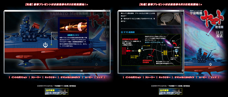 The second website (see it here) sprang up during the summer and sat dormant for a while, a single page with the announcement that advance movie tickets would go on sale September 5th. On that day, the site practically exploded with content. The home page is shown above left. The options listed beneath the logo read as follows (for the Japanese-impaired): Introduction, Story, Character, Yamato Mechanical Guide, and Movie.