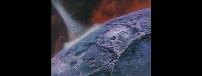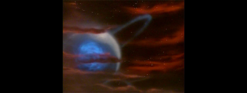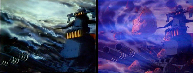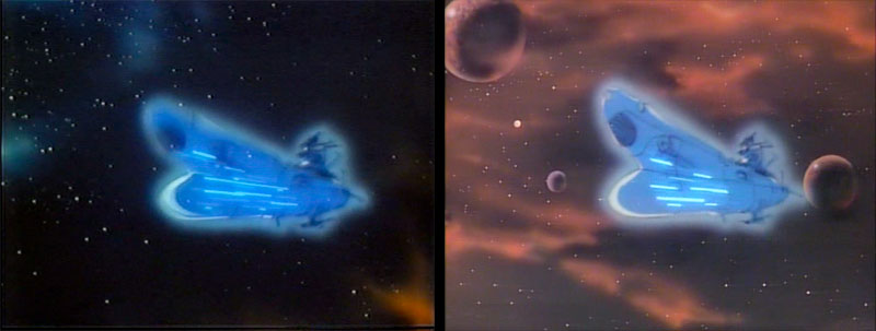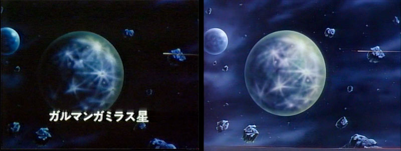 A super-wide shot shows Yamato approaching the Galman-Gamilas home planet. This was the first case of a caption in Version A that was later dropped. There will be many more.
