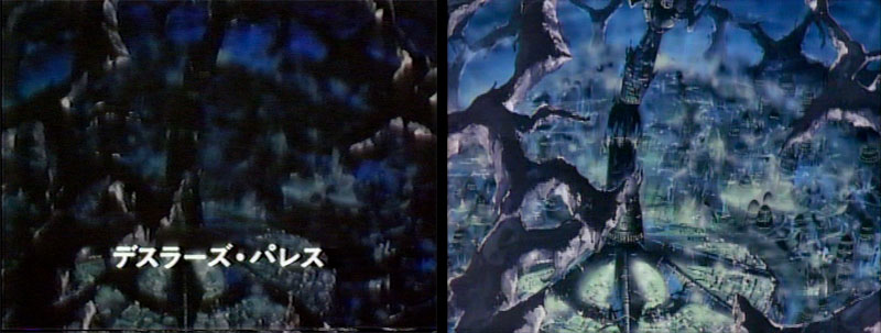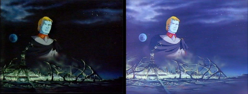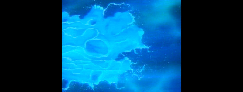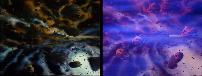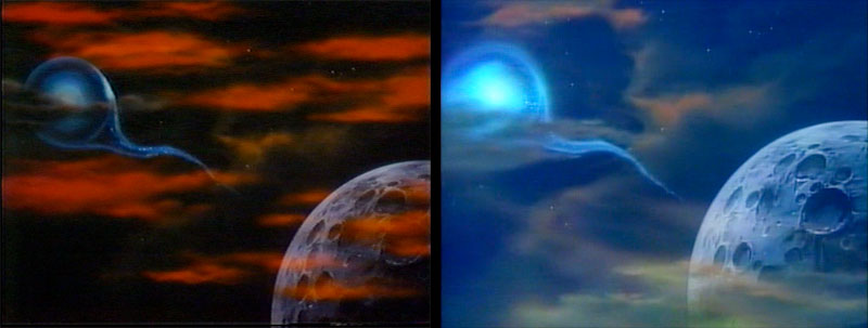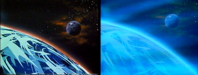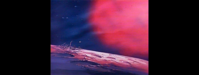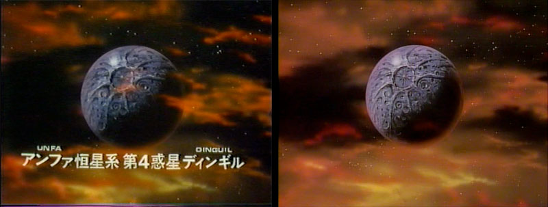 We jump to our next location, which is helpfully captioned in Version A. Such captions were a staple of previous Yamato productions, but this was the first time one included English. The title reads Unfa System 4th Planet Dinguil. Version B dropped the caption and the foreground cloud layer.