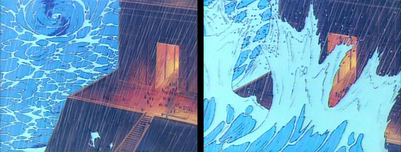 A wide shot shows Yamato pushing through the flying debris. Again, mist effects were added to Version B.