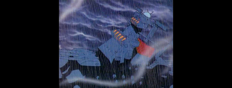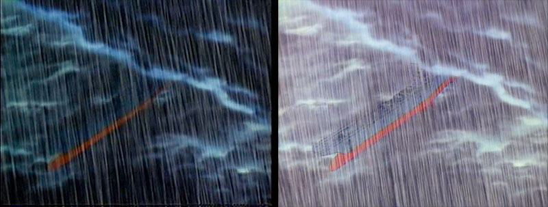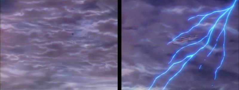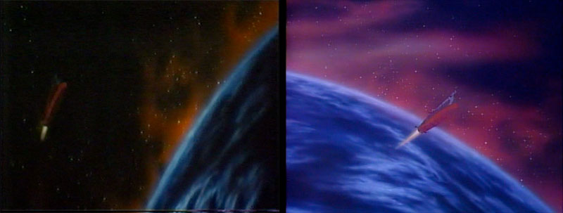 Yamato climbs away from Dinguil in two very different shots. The A version was actually borrowed from later in the film with Yamato soaring over Earth’s moon on the way home.