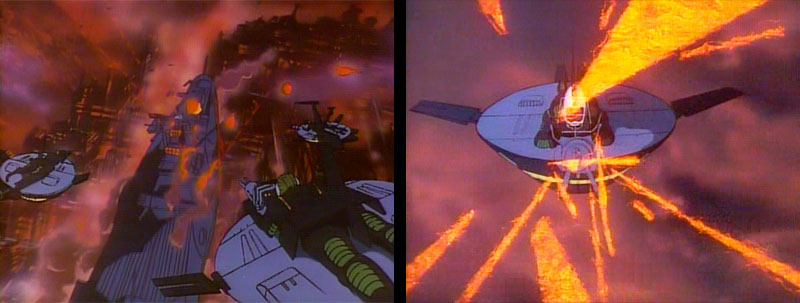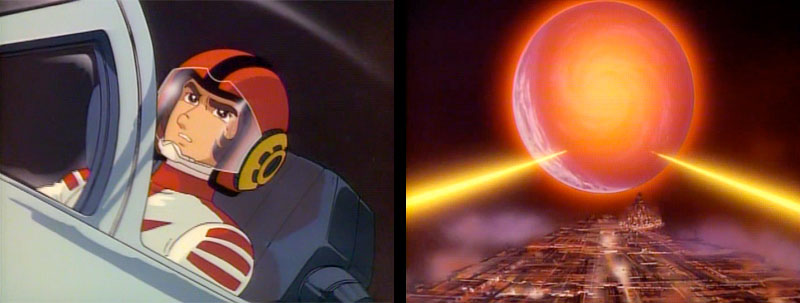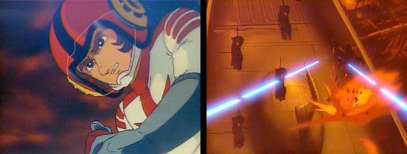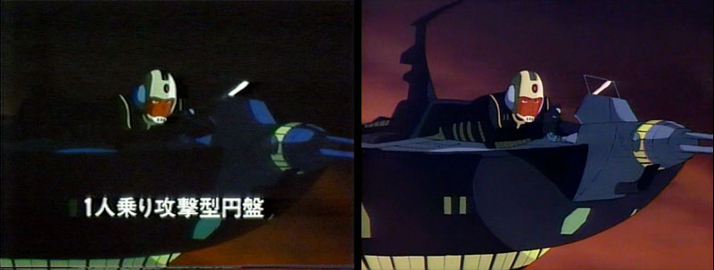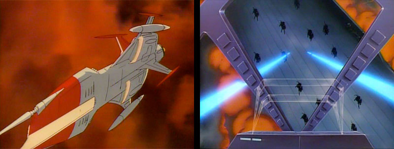 Kodai orders Shima back to the bridge and launches in the Cosmo Zero. In Version A he simply flies to his next stop. Version B adds a few scenes of him strafing Lugal’s phalanx of Robot Horses.