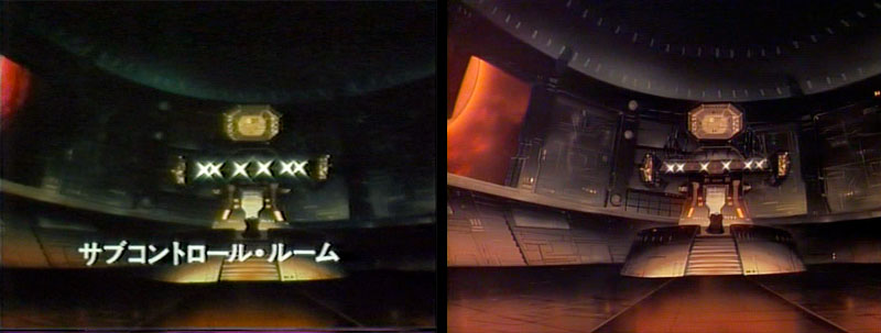 His plot thwarted and his City Satellite crumbling, the Emperor falls back on plan B: propel Aquarius toward Earth with his other warp generator from the Sub-Control Room. As usual, it is captioned in Version A only.