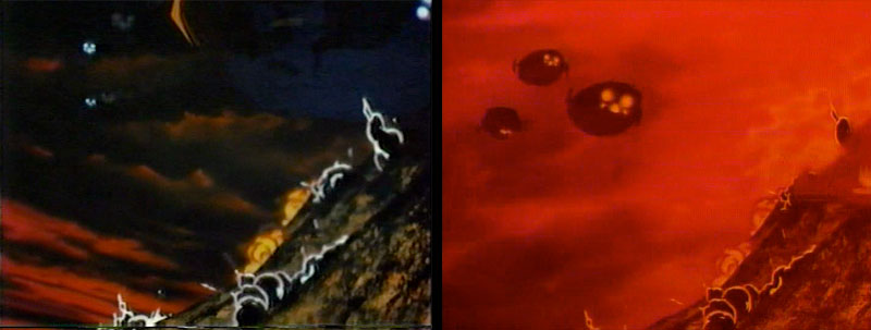 The next scene also differed quite a bit from A to B with the ships climbing away into a blood red background.
