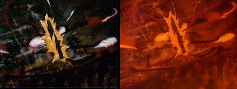 Uruk starts to explode. The colorful background of this shot in Version A was removed from Version B.