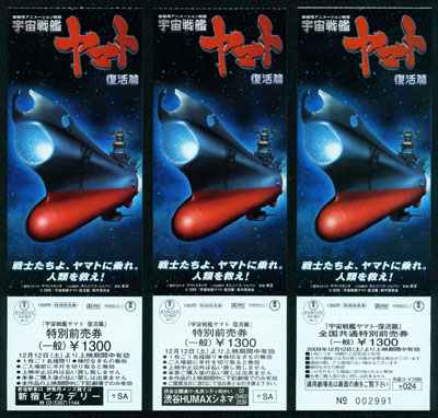 I’d seen movies in Japan before (at least one per trip is my rule) and always paid special attention to the trailers. American productions are usually in the mix, but so are Japanese films that I’ll most likely never see. This was an odd mixture; Avatar was the US film (a natural title to tack onto another SF movie) but the trailers for anime films were utterly unlike Yamato. They promoted 100% kiddie fare such as Doraemon, Pokemon, and Detective Conan. Yamato‘s very first struggle was to break away from children’s anime, and here it was being chained up again. Either that’s the only kind of anime being shown in theatres this season or someone assumed that all anime pulls in the same audience. Either way, it was a bit discouraging.