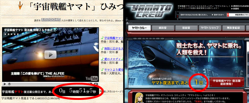 I jammed all the news I could find into this website’s December 1 update and boarded the plane 10 days later. Two of my favorite sites for Yamato news (shown above) were counting down to the premiere and the numbers were getting smaller. By then so much was going on that the movie almost seemed like an afterthought. Anton was waiting for me in the Tokyo rain when I landed, having scored the first of the new CDs, Symphonic Yamato 2009. I’d hinted that it would be nice to listen to it the night before the movie opened, and he dutifully slogged from store to store until he found copies for us both.