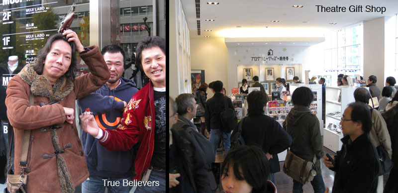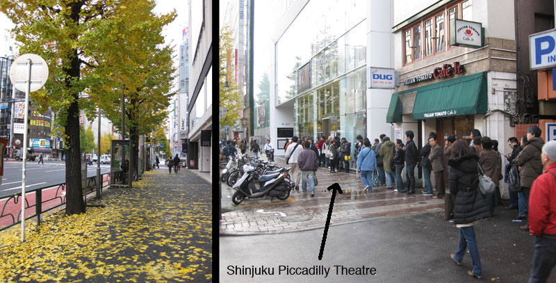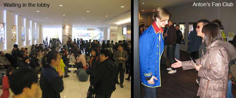 A mild winter day. The rain had abated, leaving a carpet of yellow leaves on the Tokyo sidewalks. I usually grumble when the movie theatre I’m approaching has a line outside it, but this time it was a welcome sight. It wasn’t a mob scene as seen in the years before advance ticket sales, but it was definitely a gathering of diehards. Who else would pry themselves out of bed this early on a cold morning? Anton, however, was the only one to arrive in costume, which pretty much made him the center of attention.