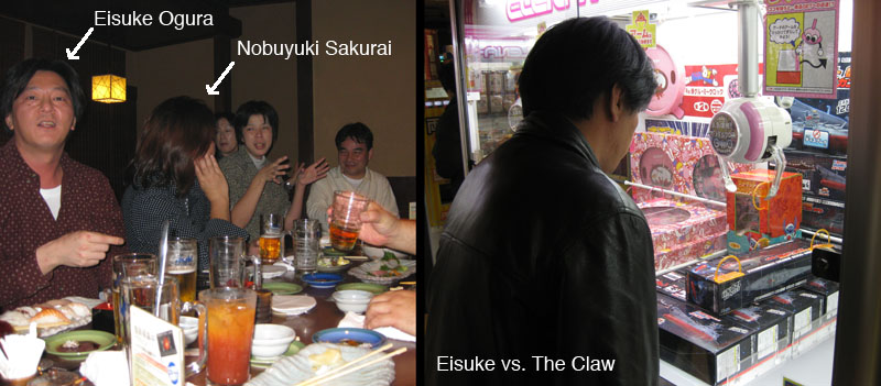 One of my goals for the trip was to find the new Taito “Super Mechanics” Yamato toy, so I asked if anyone had seen it yet. The answer was that it was still only available in UFO Catcher games. There just happened to be a Taito arcade right around the corner, so after our meal Eisuke charged into the fray, determined to win one for me. He made a valiant effort, but not even his Kung Fu could overcome a metal claw with all the grabbing power of wet spaghetti. Fortunately, I was able to find one a couple days later in a second-hand toy store. Those machines are not escape-proof after all.