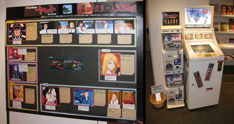 This wasn’t on display yet, but there were several other attractions. A board was set up showing all the characters from the film with sticker-dots you could apply to vote for your favorites. Two nearby vending machines (probably unique to Humax) doled out customized Yamato stickers and the strap mascots shown below left.
