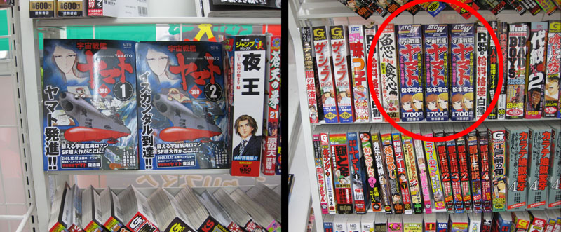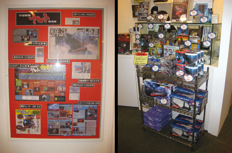 Yamato DVDs and manga reprints were easy to find, and I must admit it was reassuring to know that Yamato manga was just around the corner from my hotel 24 hours a day. (You know, in case of emergencies.) But despite the lack of food items I still regularly heard pre-recorded promos for them on all the stores’ PA systems. Thus, the “wave-motion dog” and “black hole roll” live on in name only.