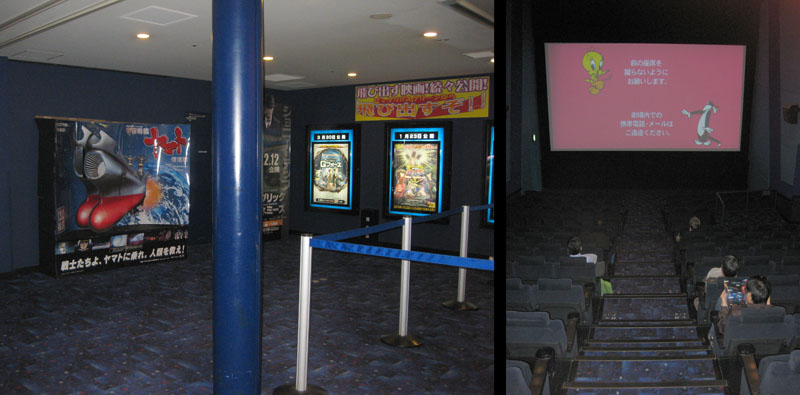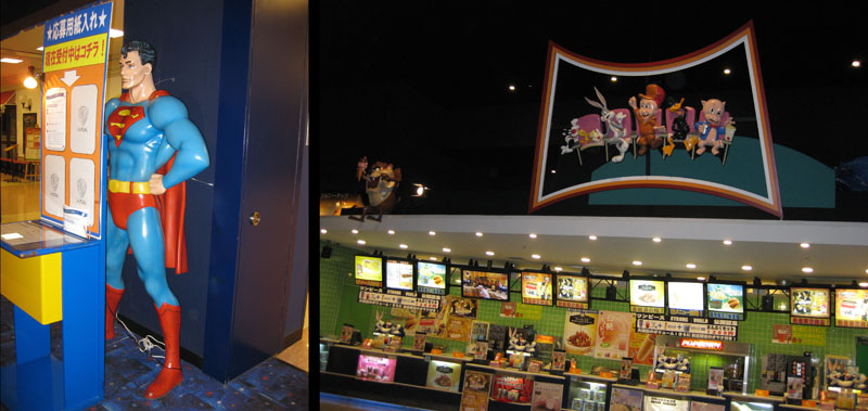 Anti-trust laws prevent Warner Brothers, a maker of motion pictures, from opening theatres in the US, but since those laws don’t apply in Japan, WB can do as they will here. The result is a bright, attractive space populated by Warner characters. The apparent concern of anti-trust litigators is that Warner would block out films from other studios, but nothing of the sort takes place here. All the proof I needed is that they were showing a Toei production named Space Battleship Yamato Resurrection.