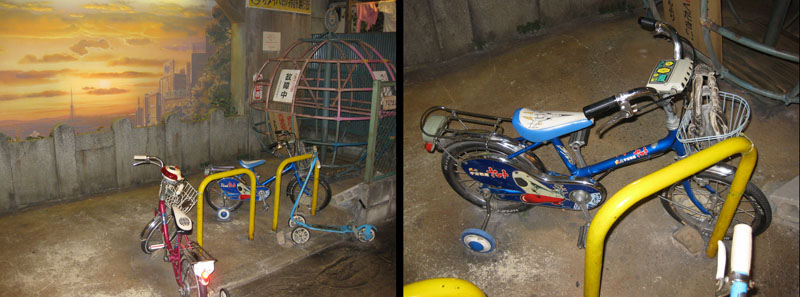 I quickly found the one object I was specifically looking for: the famed Yamato bicycle, bolted down in a mini-reproduction of a children’s playground with a mural of a Tokyo cityscape behind it. The painted afternoon sun cast a golden light that undoubtedly fills many adult memories even if it wasn’t really like that.