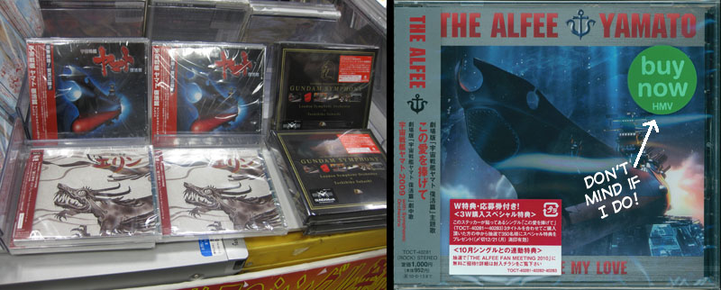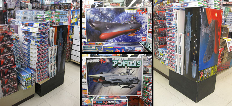 Before our 11am rendezvous in Shinjuku I checked a few music stores that all came up blank. I had a few minutes to duck into a hobby shop and was lucky enough to find both of the newly-reissued Bandai model kits of the 1/700 Yamato and Andromeda. I didn’t intend to buy them, but they photographed nicely. It also gave me a rare opportunity to commune with the massive 1/350 Yamato model. This, too, is off my buy list (I’d need an extra plane ticket to get it home) but it was interesting to see it measured against a sizeable stack of other Yamato kits. It’s the one sitting on end and big enough to hide a child in.