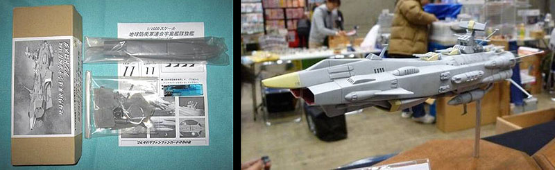 These are three examples of just how eclectic the garage kit realm can get: different styles of ceramic Gamilon goblet from a company named Fujimoto Kiln, and a modification kit for Bandai’s 1/700 scale Yamato by someone who thought the pulse laser batteries needed improving.