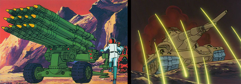 Sanada finishes constructing a multi-missile launcher which is quickly aimed and fired. It shoots about 15 mini-missiles high above the battlefield. Near the top of its arc, the missiles explode, unleashing a rain of energy that burns through the tanks. The only tanks that survive are Zabaibal’s and Saito’s. Zabaibal retreats, pursued by Saito.