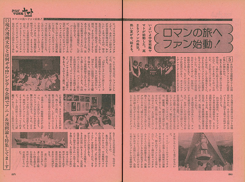 A full-size Analyzer stood near the entrance of the meeting place, and many people used the interval to take photos. As expected, they were all fan club representatives. A model of Yamato was placed on the front right of the room where a good many cameras and tape recorders were being held, and a number of paintings from Part II were on the wall nearby.