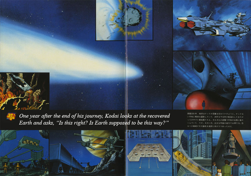 Having received enthusiastic support, Space Battleship Yamato continues on its voyage, and its force is ever increasing. What is Yamato‘s secret that attracts young boys and girls? It originates from their premonition of a crisis they face as human beings in circumstances that reduce them to units of a controlled society. Children in particular long for the power to change such a society. They try to understand their own depths by participating in the struggle. At the core of such desire lies an optimism that believes in human beings and their future.