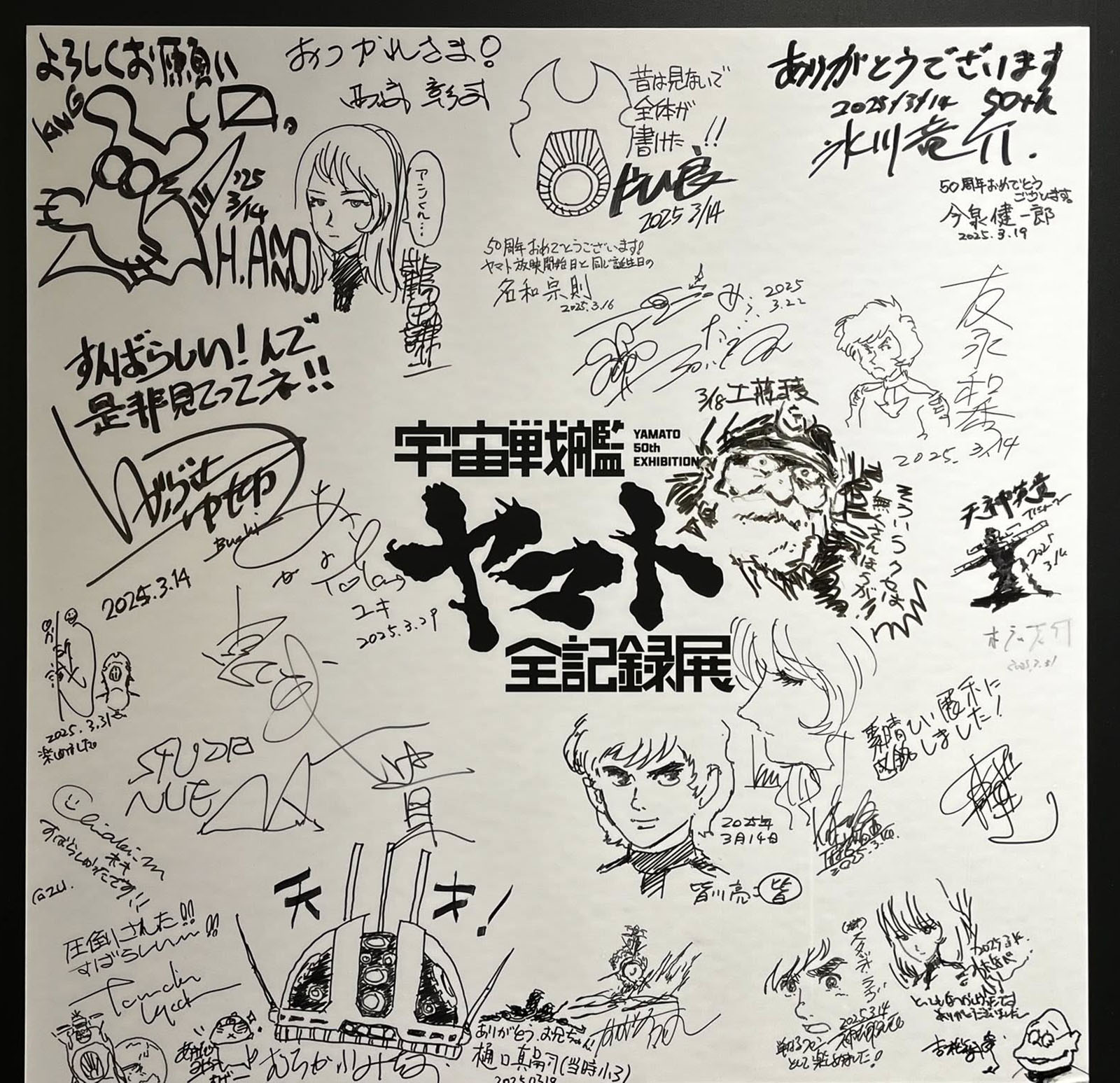 The exit area brought together autograph boards from the first two exhibitions and a display case with other materials.