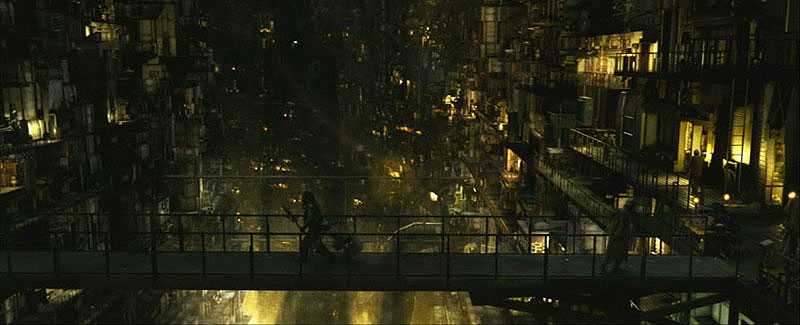 In a tiny, squalid room a man puts on anti-radiation gear as his roommates taunt him for constantly going up to the surface to salvage scrap. When the man (his face now covered by a mask) says he trades the scrap to his brother in the service, the taunting changes to pleading–those in the service have it much better than others–but the man shoves his way out of the room and out onto a balcony looking down over a vast underground city.