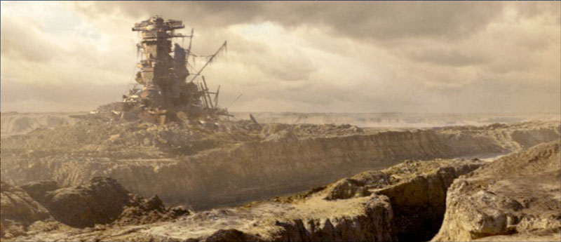 On the Earth’s desolate surface, the only structures in sight are the ancient hull of Battleship Yamato and an elevator that lifts the man into harsh sunlight.
