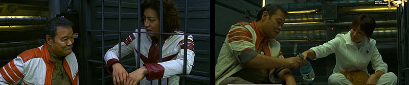 Now stuck in a cell, Kodai is visited by Chief Engineer Tokugawa (another old friend) who observes that he and Okita are more alike than it would appear. Dr. Sado arrives with some sake to calm the nerves and mentions to Kodai that he wasn’t the only one to lose family at Mars. At that moment, Okita gazes sadly at a photo of his son.