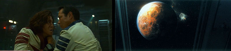 Yamato reappears and Sanada grabs Kodai, furious at the gamble he just took. But in fact, they have only moved to the other side of Iscandar. This side looks quite different; a rugged red surface that reminds everyone of what Earth has become. It’s as if two planets had merged. The truth is realized; Iscandar and Gamilas are one. This is still their destination–the coordinates from the message capsule are beneath its surface.