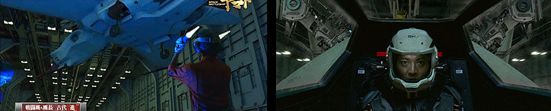 The marines and other crew go right into action, raking the hangar with gunfire. The creature (called a “Gamilasborg” in the novelization and a “Gamilasroid” on soundtrack CD) leaps and dodges like an insect until it is finally brought down. Saito edges toward it, his rifle trained on its unmoving form. The blue light coalesces and rises out of it, then leaps into his body! He convulses as it races through his system, then levitates to his feet and gathers himself.