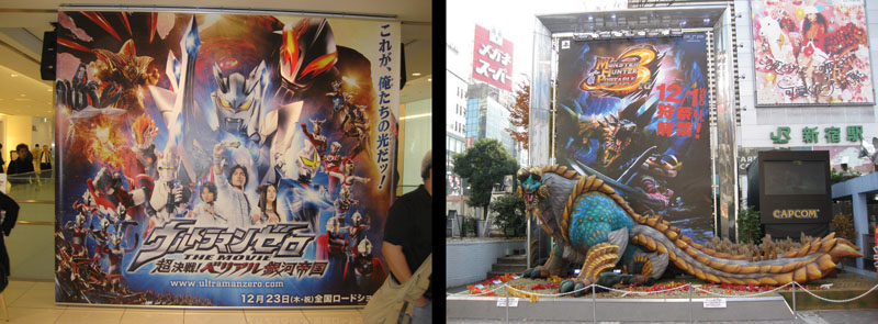 Other attractions: The inescapable Ultraman had a new movie out, Ultraman Zero. The previous film was being promoted exactly a year earlier. Meanwhile, Capcom was making noise about the release of Monster Hunter 3, which resulted in this giant (inflatable!) creature display outside Shinjuku station with some occasional live heroes in costume.