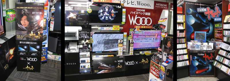 Spotted inside a massive Akihabara electronics store: a display for the Hitachi Wooo HD TV (with a Yamato tie-in) and a corner display for last year’s Yamato Resurrection with CDs and DVDs.