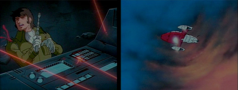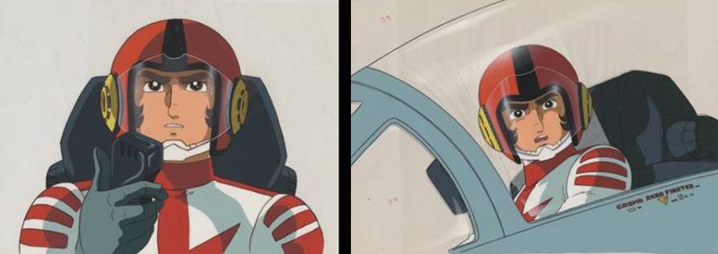 Production credits flow over the scene. In the black sea of space, we see the white contrail of an approaching space fighter. The pilots wears a spacesuit. The face inside the helmet is Susumu Kodai’s.
