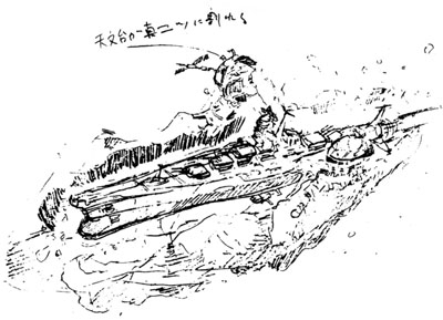 Sanada slowly walks over to a black wall and pushes a switch. The black wall is a curtain of liquid that slowly rises up to the dome of the rock. It reveals Yamato overturned, its hull sunken into the rock. Its entire body is covered in rust and does not seem at all alive.