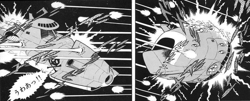 The two fight tooth and nail, emptying their guns into each others’ hulls. After several pages of brutality, Harlock prevails and his ship limps away leaving Romel and his dead crew floating in space.