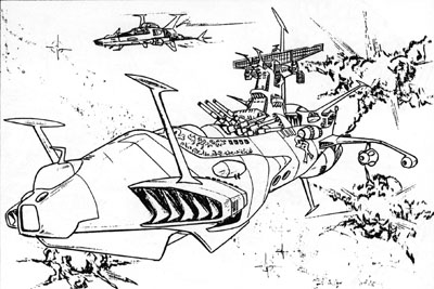 Shown at left is an early image used to pitch Space Pirate, which finally gave Harlock his signature spaceship, the Arcadia [below]. The TV series ran 42 episodes from 1978 to ’79 and though it never quite measured up to Yamato‘s production values, it had tremendous appeal to the same viewership and quickly made its way to classic status due in no small part to the innovative directing style of Rin Taro.
