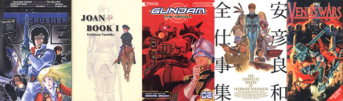 “Yas” productions available in the US (left to right): Crusher Joe (DVD from Animeigo), Joan (manga from Comics One), Gundam the Origin (Viz Comics), Art book (Media Factory) and Venus Wars (VHS from U.S. Manga Corps)